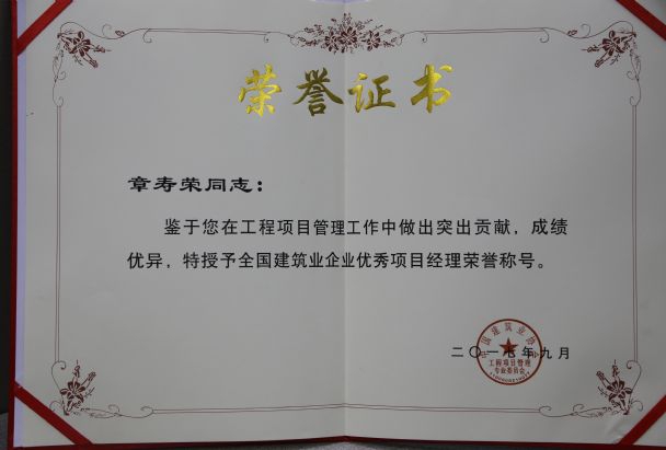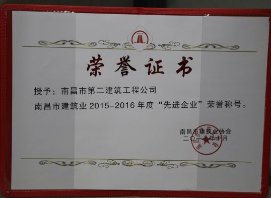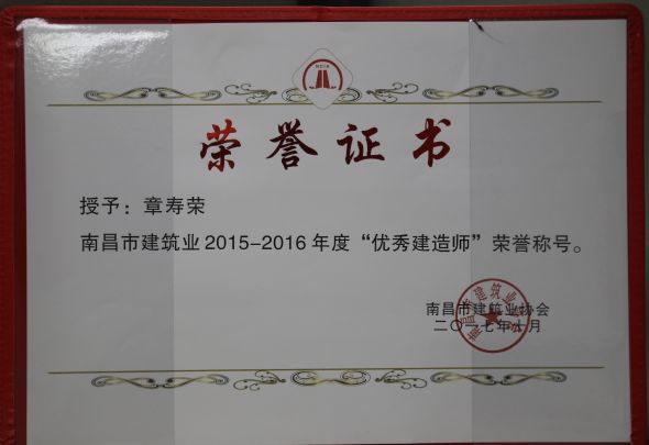 南昌市建筑業(yè)協(xié)會(huì )對公司頒發(fā)了南昌市建筑業(yè)2015-2016年度“先進(jìn)企業(yè)”榮譽(yù)稱(chēng)號,對公司建造師章壽榮、何靜、胡建平、高波頒發(fā)了南昌市建筑業(yè)2015-2016年度“優(yōu)秀建造師”榮譽(yù)稱(chēng)號;中國建筑業(yè)協(xié)會(huì )對章壽榮頒發(fā)了全國建筑業(yè)企業(yè)優(yōu)秀項目經(jīng)理榮譽(yù)稱(chēng)號。