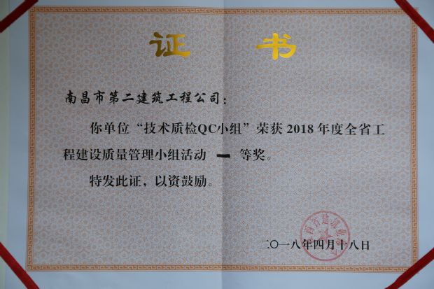 昨日,在全省QC成果發(fā)布會(huì )上,公司技術(shù)質(zhì)檢QC小組榮獲2018年度全省工程建設質(zhì)量管理小組活動(dòng)一等獎。