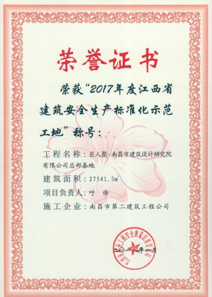 公司承建的郭家莊地塊棚戶(hù)區改造項目(安置房)工程、匠人聚.南昌市建筑設計研究院有限公司總部基地榮獲2017年度江西省建筑安全生產(chǎn)標準化示范工地稱(chēng)號。